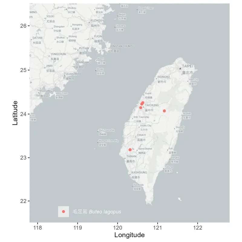 在台灣,毛足鵟屬於稀有的冬候鳥,通常單獨出現。